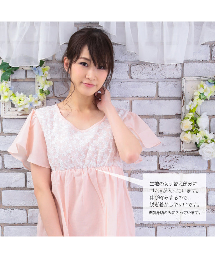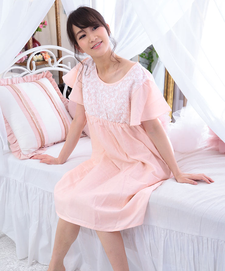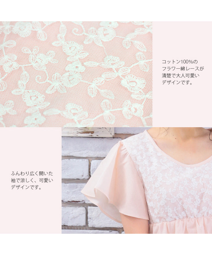 胸元に上品でかわいいコットン100%フラワー綿レースがデザインされたルームウェア。