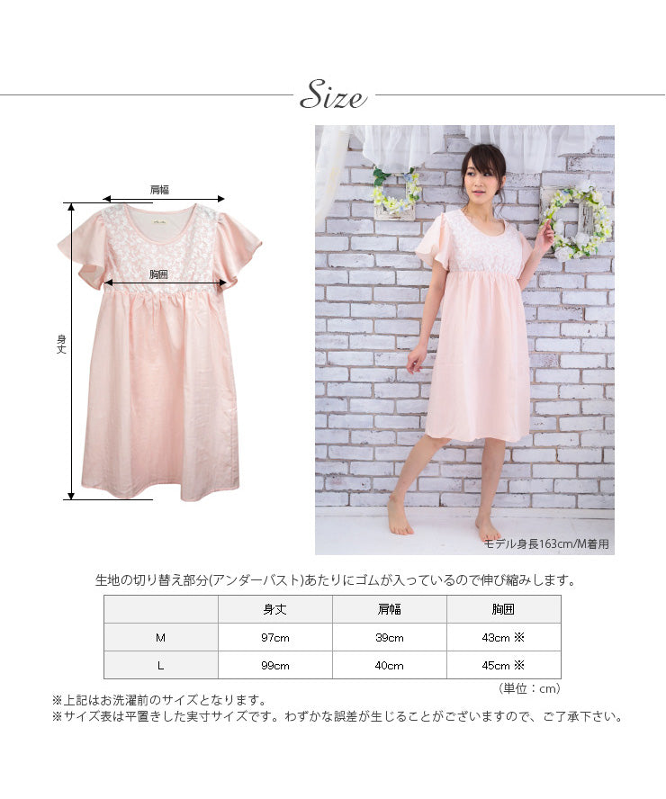 | サイズ | ※サイズは平置き実寸サイズです。(単位:cm) ●M(身丈:97、肩幅:39、胸囲:43) ●L(身丈:99、肩幅:40、胸囲:45) 生地の切り替え部分(アンダーバスト)あたりにゴムが入っているので伸び縮みします。  |